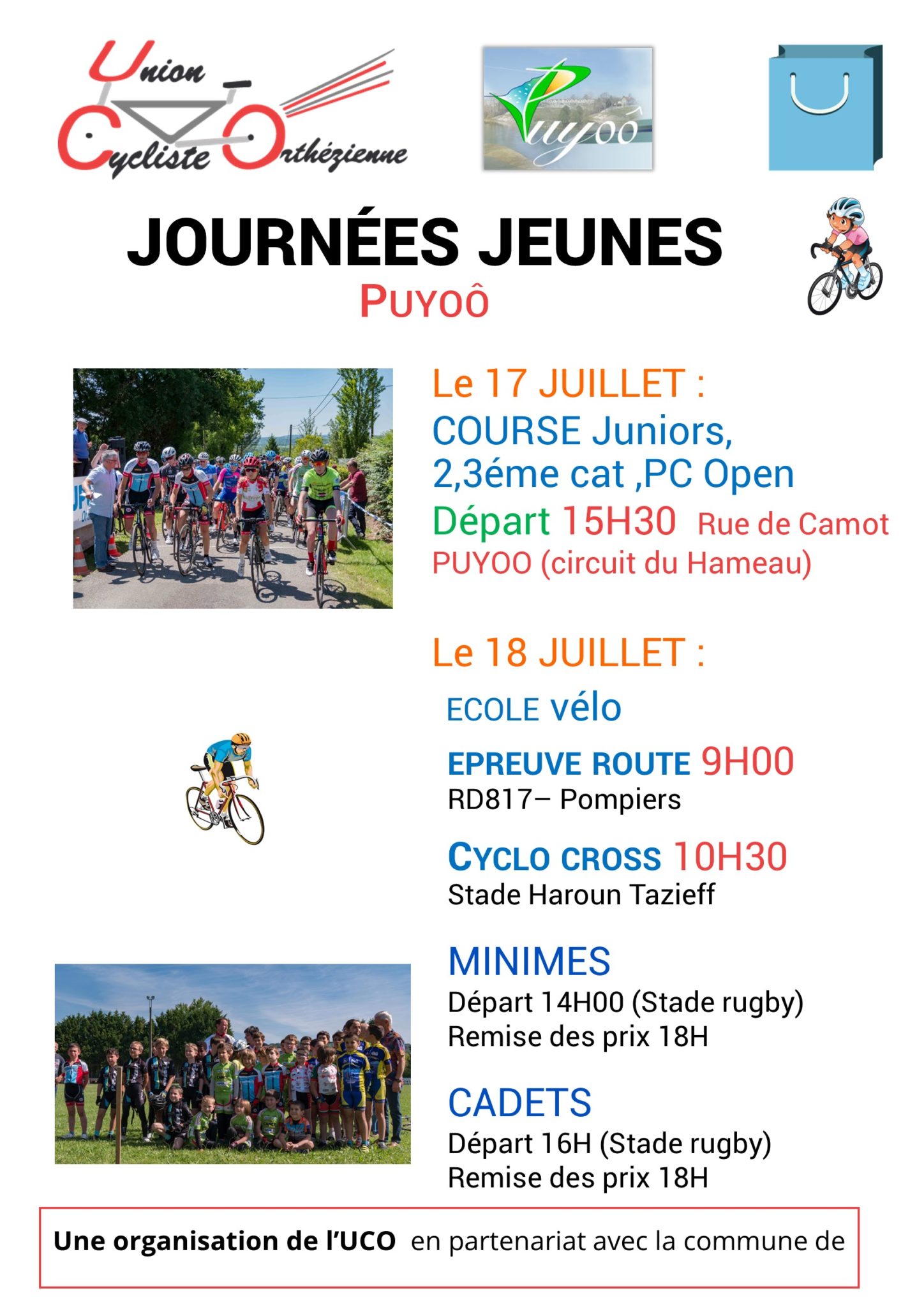 Les épreuves minimes et cadets de Salles Mongiscard ayant du plomb dans les roues, l’Union cycliste orthézienne organise les « journées jeunes cyclistes » à PUYOO les 17 et 18 juillet 2021, journées jeunes répondant au désir du club de réaliser au moins une course par an et par catégorie.